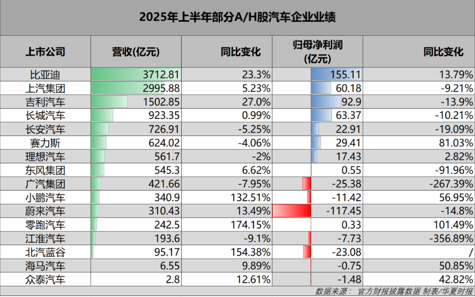 华夏时报记者 温冲 于建平 北京报道 2025年上半年,汽车行业格局持续演变,部分汽车企业业绩呈现出明显分化态势,有人营收、净利润双双实现增长,有人增收不增利,也有人营收、净利润双双下滑。 《华夏时报》记者统计16家A/H股上市车企(以乘用车为主)半年报财报数据。其中11家车企营收实现增长,9家实现盈利,盈利占比过半。比亚迪以3712.81亿元营收、155.11亿元净利润稳居行业榜首,是唯一实现营收突破3000亿元、净利润超150亿元的车企。吉利、长城、上汽集团传统车企的底蕴仍在,净利润维持在60亿元以上,但不容忽视的是三家车企的净利润均出现约10%左右的下滑。 同时,记者还仔细对比了与华为合作推出“五界”品牌的车企业绩与销量情况,发现问界及其所属的赛力斯依旧是主要力量,其他四家仍急需上量。此外,造车新势力“四小龙”差异较大,理想连续11个季度盈利,零跑首次实现半年盈利,小鹏与蔚来还挣扎在盈利亏上。 ![]() 传统车企开始分化 但底蕴仍在发挥作用 2025年上半年,汽车行业收入50917亿元,同比增长8%;成本44780亿元,同比增长9%;利润2444亿元,同比增长3.6%;汽车行业利润率4.8%,相对于下游工业企业利润率5.7%的平均水平,仍然偏低,但较1—5月的4.3%,利润率有所改善。全国乘用车市场信息联席会秘书长崔东树对《华夏时报》记者表示,国家反内卷工作的持续推进,对改善行业利润的促进效果已经有所体现。 比亚迪无论是营收还是净利润都稳居第一,且增速远高于行业平均水平。财报显示,上半年,比亚迪营收3712.81亿元,同比增长23.3%,净利润为155.11亿元,同比增长13.79%。更重要的是,比亚迪的高利润是在高研发投入背景下实现的。上半年,比亚迪研发投入309亿元,高出同期净利润一倍。 吉利汽车上半年营收同比增长27%,达1502.85亿元,但归母净利润同比下降13.9%,至92.9亿元。吉利汽车方面称,上半年净利润同比下滑主要原因在于“2024年同期有一项涉及雷诺汽车的交易,因出售相关资产获得收益。就核心的汽车业务而言,今年同期盈利能力有提升”。 国泰海通研报认为,吉利汽车的品牌架构较为合理且清晰,随着“智能吉利2025”战略的逐步落地,公司整体营收和归母净利润有望持续增长。目前,吉利汽车已将今年汽车销量目标由此前定下的271万辆提升至300万辆。 与吉利一样出现增收不增利的还有长城汽车。财报显示,今年上半年,长城汽车营收923.35亿元,同比增长0.99%,净利润63.37亿元,同比下滑10.21%。值得注意的是,长城汽车第二季度业绩要优于第一季度。今年第二季度,长城汽车实现营收523.16亿元,同比增长7.72%;实现归母净利润45.86亿元,同比增长19.42%。 长安汽车、东风集团、广汽集团则因为合资车企集体哑火而出现业绩承压。 长安汽车发布纳入新央企、新长安体系后的首份半年报,却出现了营收、净利润双双下滑的局面。2025年上半年,长安汽车营业收入726.91亿元,同比下滑5.25%;归母净利润22.91亿元,同比下降19.09%。其扣非净利润同比增长26.36%,为14.77亿元。在重组大背景下能保持如此业绩,整体表现可圈可点。 东风集团上半年收入545.3亿元,同比增长6.6%;归属于上市公司股东净利润0.55亿元,较去年同期的6.84亿元下滑近92%。不过,东风集团上半年毛利润75.99亿元,同比增长28%;毛利率达13.9%,同比提升2.3个百分点。在与长安的合并告破之后,东风集团仍在积极求变。8月,东风集团宣布子公司岚图汽车将以介绍上市方式登陆港股,东风集团股份将同步完成私有化退市。招商证券研报认为,此举有望强化东风战略布局,树立改革创新新标杆。 广汽集团营收与净利润双双下滑。2025年上半年,广汽集团营收421.66亿元,同比下滑7.95%;净利润亏损25.38亿元,同比下降267.39%。广汽集团在财报中表示,受汽车行业竞争激烈等因素影响,集团汽车销量下降;重点推出的多款新能源车型销量仍处于爬坡期等多重因素叠加,整体经营成效未达预期目标。 9月19日,广汽集团宣布与华为的合作升级,双方将联合打造全新品牌——“启境”,定位为高端智能新能源汽车品牌。根据双方规划,启境汽车将全系搭载华为乾崑最先进的智能技术。 华为“五界”急需上量 背后车企各显神通 与华为合作推出“五界”的车企中,赛力斯、北汽蓝谷、江淮汽车、上汽集团四家车企已经实现上市,奇瑞汽车正在做最后的IPO冲刺。 手握“问界”的赛力斯,是2025年上半年盈利改善最显著的车企之一。财报显示,赛力斯上半年实现营业收入624.02亿元,同比下滑4.06%,净利润29.41亿元,同比增长81.03%。 赛力斯上半年净利润实现增长,主要得益于高端车型销量增长与产品结构优化。数据显示,2025年上半年,赛力斯新能源汽车销量达17.2万辆,其中问界交付14.7万辆。高端车型问界M9和M8分别交付6.2万辆和3.5万辆,成为50万元级和40万元级市场销量冠军,带动公司利润大幅提升。 问界的成功,赛力斯业绩的增长,以及赛力斯股价从不足10元涨至140多元、市值飙升至2300多亿元,都让业界看到了车企与华为鸿蒙智行合作的可行性。但到目前为止,其他后来者还没能完全复制这份成功。 持续亏损的北汽蓝谷并没有因为“享界”的推出而实现扭亏。财报显示,今年上半年北汽蓝谷营收为95.17亿元,同比增长154.38%;净亏损23.08亿元,扣除非经常性损益后净亏损23.36亿元。 作为华为“五界”中最贵的一界,“尊界”是江淮汽车近乎压上一切的产物,不惜
